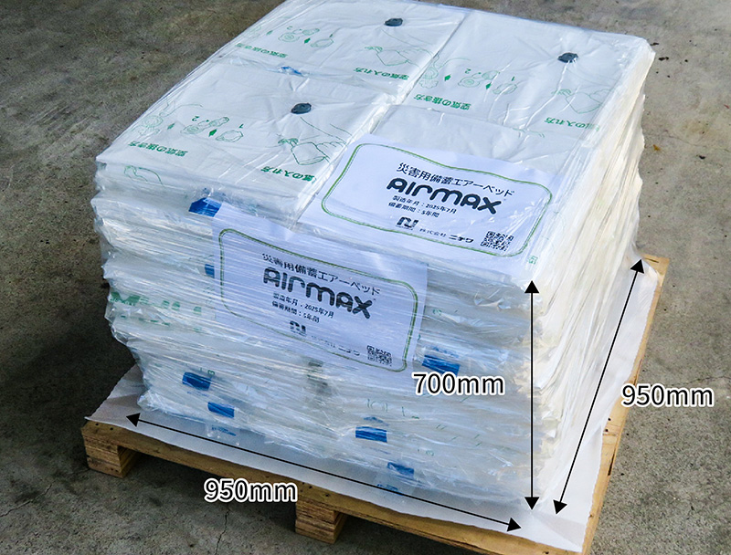 airmaxエアーベッド5枚で1セット。1パレット200枚積載可能で、高い物流効率を実現。